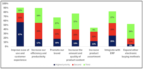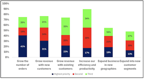 Industrial distributors demonstrate clear hierarchies in both financial and operational priorities driving e-commerce investment decisions. Asked about their top ecommerce financial objective, the largest number (41%) chose growing order volume. But the data shows that volume alone does not produce strong outcomes.